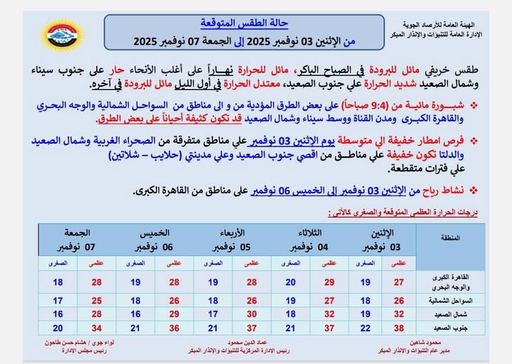 حالة الطقس المتوقعة من الاثنين 03 نوفمبر 2025 الى الجمعة 07 نوفمبر 2025