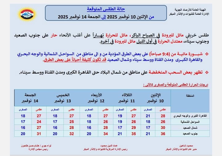 حالة الطقس المتوقعة من الاثنين 10 نوفمبر 2025الى الجمعة 14 نوفمبر 2025