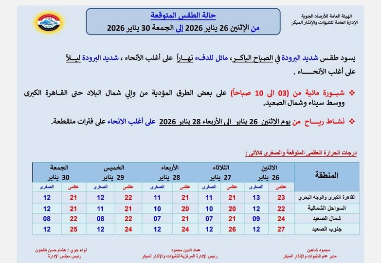 حالة الطقس المتوقعة من الاثنين 26 يناير 2026 الى الجمعة 30 يناير 2026
