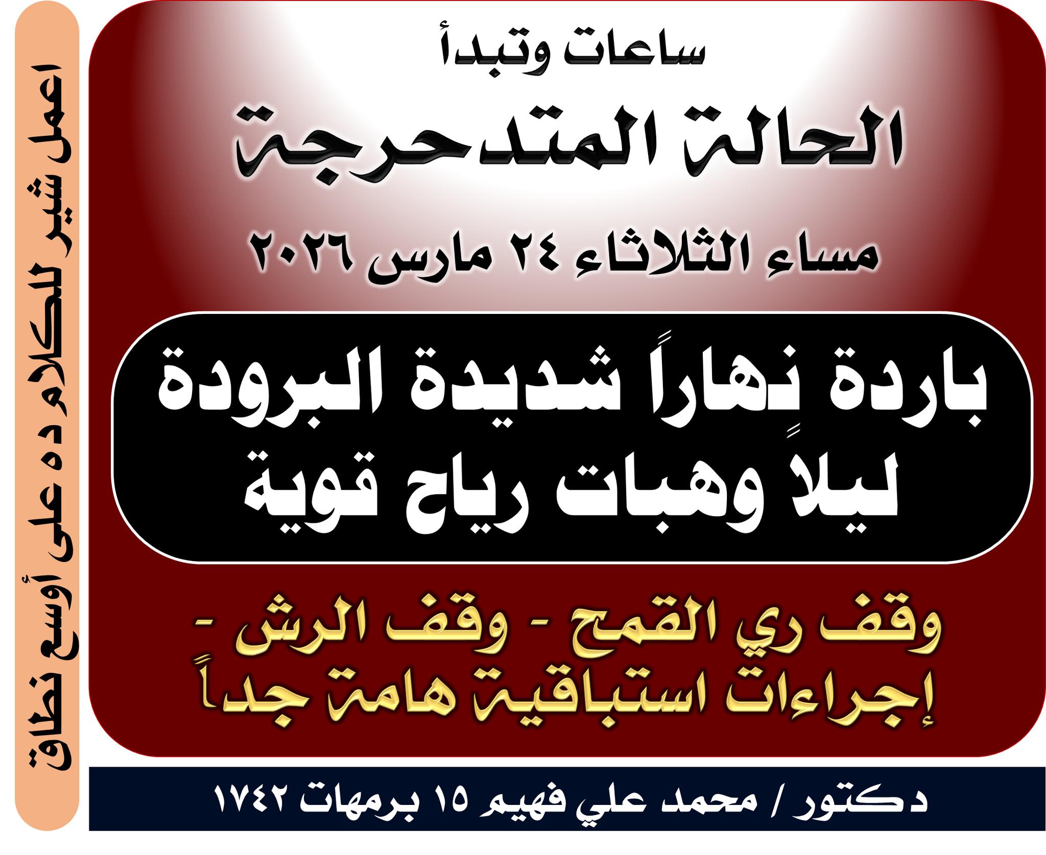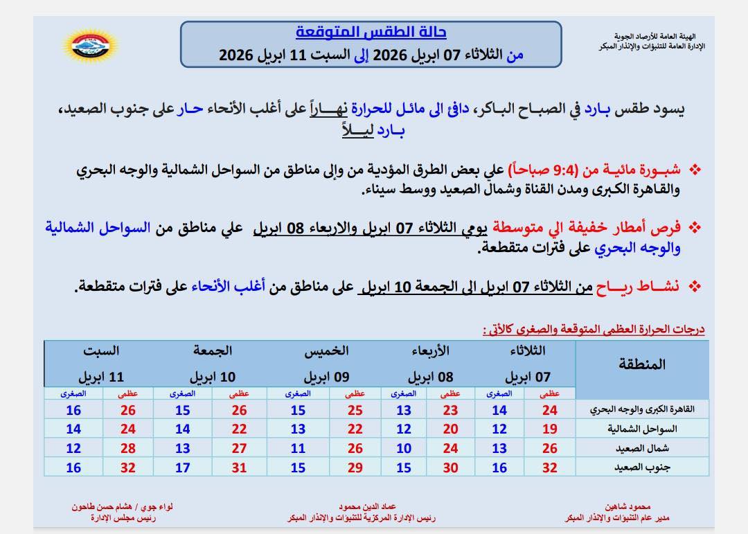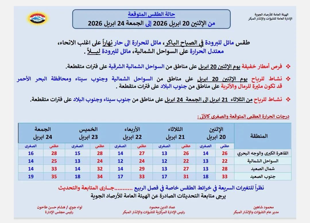 حالة الطقس المتوقعة من الاتنين 20ابريل 2026 الى الجمعة 24أبريل 2026