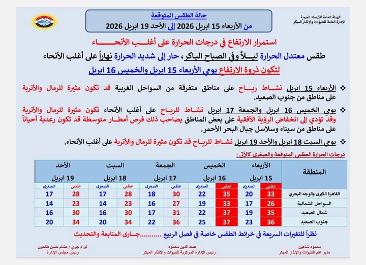 حالة الطقس المتوقعة من الاربعاء 15 ابريل 2026 الى الاحد 19 ابريل 2026