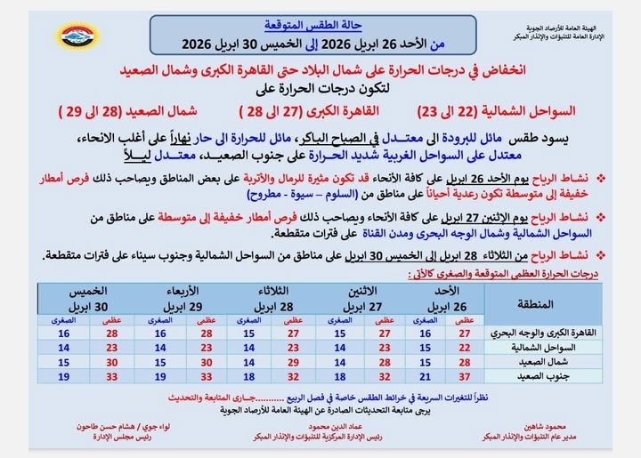 حالة الطقس المتوقعة من الاحد 26 ابريل 2026 الى الخميس 30 ابريل 2026